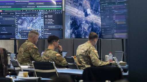 U.S. Army personnel monitor screens displaying maps and imagery of the Gaza Strip during a media tour inside the Civil-Military Coordination Center (CMCC) on November 20, 2025 in Kiryat Gat, Israel. The screen (above left) shows the use of Palantir’s Gaia application, billed as a tool to “bring the battlefield into view.” Photo by Amir Levy/Getty Images.