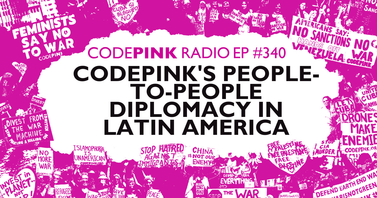 Episode 340: CODEPINK’s People-to-People Diplomacy in Latin America: In this episode of CODEPINK Radio, hosts Marcy Winograd and Leo Flores highlight CODEPINK’s peace delegation to Venezuela and CODEPINK’s upcoming flotilla to break the US siege on Cuba. Our hosts also analyze why Secretary of State, Rubio embraced empire at the Munich Security Conference, and why Trump cries “fake news” when the Chair of the Joint Chiefs warns him not to attack Iran.