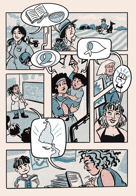 The selection was made in collaboration with Feminismo Gráfico (Graphic Feminism), a collective dedicated to compiling, recovering, and showcasing Argentinian women creators of comics and graphic humour from the early twentieth century to the present. Feminismo Gráfico builds a critical genealogy of the comics medium from a feminist perspective, contesting meanings in a popular language that has long been undervalued and centring the experiences of women and dissident genders and sexualities. Visit their archive at feminismografico.com.