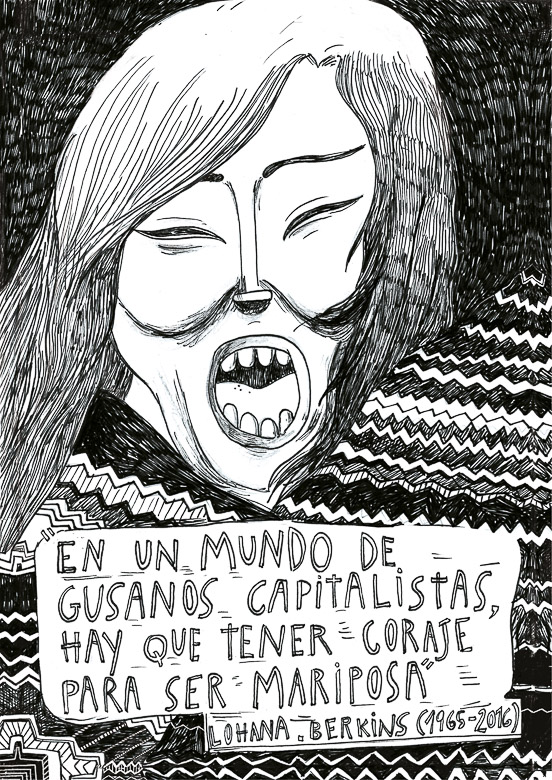The text in the image is a direct quote from Lohana Berkins (1965–2016): ‘In a world of capitalist worms, you have to have the courage to be a butterfly’. Berkins was an Argentinian travesti-trans18 leader, founder of Asociación de Travestis, Transexuales y Transgéneros de Argentina (Argentinian Association of Travestis, Transsexuals, and Transgender People, ATTTA) and a key driving force behind Argentina’s Gender Identity Law of 2012 (Law 26.743).