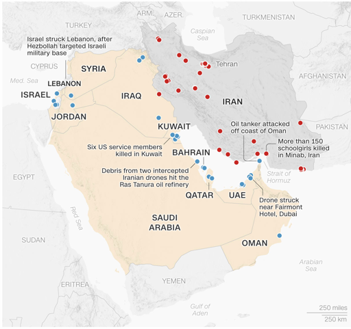 Iran responded with retaliatory missile and drone attacks targeting U.S. and Israeli positions. Eight Arab countries have reported missile attacks: the United Arab Emirates, Bahrain, Kuwait, Saudi Arabia, Iraq, Jordan, Oman, and Qatar. In addition, the Revolutionary Guards also claims attacks on U.S. and British oil tankers, and the destruction of some U.S. cruisers and destroyers.