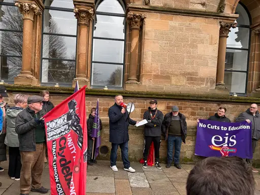 The Dumbarton rally, organised by Clydebank TUC, came together as councillors met to set an annual budget which threatened cuts of up to £14 million, including a £300,000 cut to education budgets.