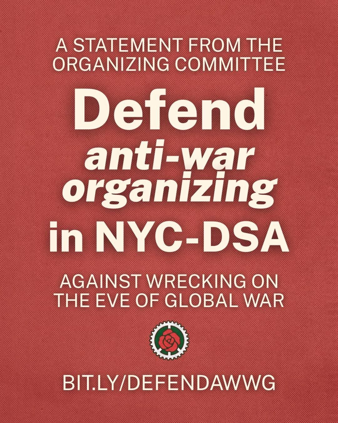 We are frustrated and disappointed with NYC-DSA Steering Committee’s decision to seize control of the Anti-War Working Group’s Organizing Committee (AWWG OC) elections from the working group itself and announce chapterwide elections instead. We are also deeply disappointed by the Steering Committee’s cynical invocation of the US-Israel war on Iran as a justification for actively disorganizing the work that existing AWWG leaders and bodies are doing to end the war.