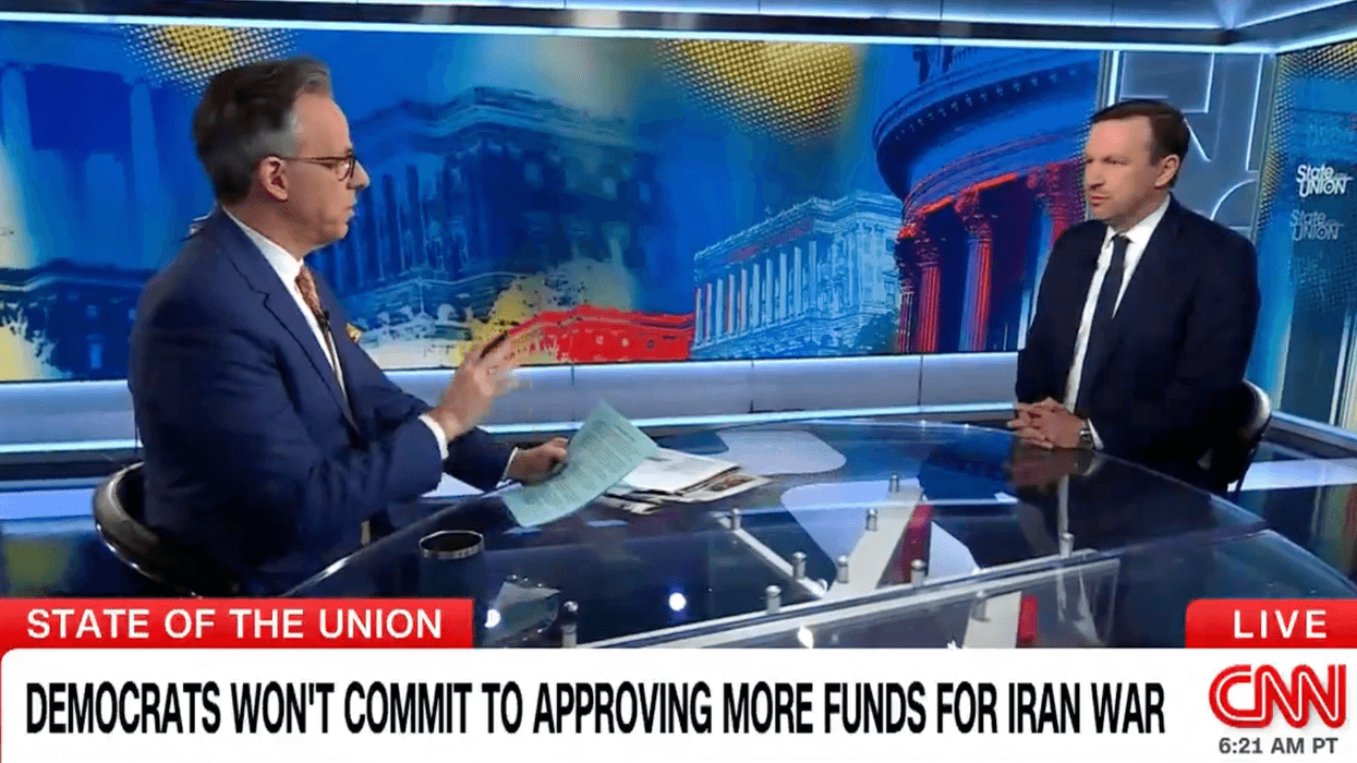 Sen. Chris Murphy of Connecticut offered immediate push back on Sunday when CNN anchorJake Tapper said a vote against an expected $50 billion request by President Donald Trump to fund his attack on Iran would be seen as “voting against the troops.”