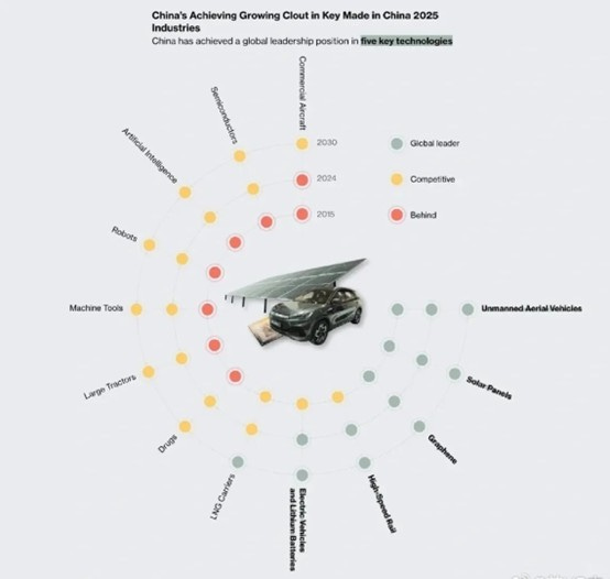 This is the second time we’ve used this chart, and the second time I’m apologizing for it. It’s the worst-designed chart I’ve ever seen. If a viewer has to stretch and twist his neck to understand it, it should have a warning label. The inside ring is China in 2015, when Made In China 2025 was first announced. The middle ring is the progress made, industry by industry, by 2024. China is “competitive” or “global leader” in all but one of these most important strategic industries.