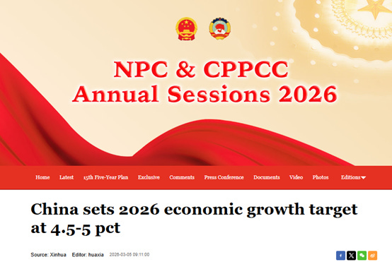 Reuters, China sets 2026 growth target at 4.5%–5%, below last year’s pace