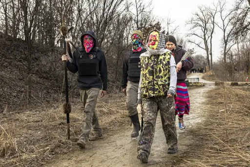 Indigenous leaders from different tribes who arrived with the 25 Dakota Men walk with camp residents toward the prayer camp near Mni Owe Sni in Minneapolis on March 5. (Kerem Yücel/MPR News)