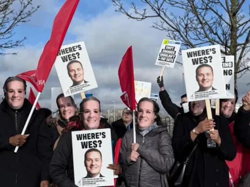 Protesters wearing Wes Streeting masks hold signs saying Where's Wes?