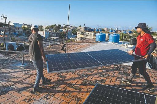 Technicians carry a solar panel on the rooftop of a building in Havana. Cubans face an energy shortage brought on by a recent intensification of the U.S. economic blockade. In a remarkable example of international solidarity, Cuba, with the aid of China, has more than tripled its solar power production . . .