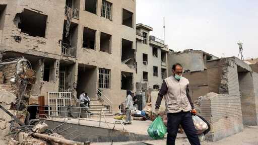 Iranians collect belongings from a damaged residential building in Tehran following U.S-Israeli airstrikes, on March 12, 2026. Photo by AFP via Getty Images.