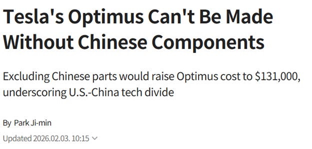 The problem is that the supply chains for humanoid robots all run through China, and the stated intention of Tesla is to build robots for American factories that will be in direct competition against factories here. This is the business model, for Tesla: buy parts and components from hundreds of Chinese suppliers, then ship them to Fremont for final assembly and branding, then market them to American factories that will compete against Chinese ones.