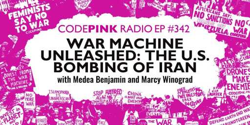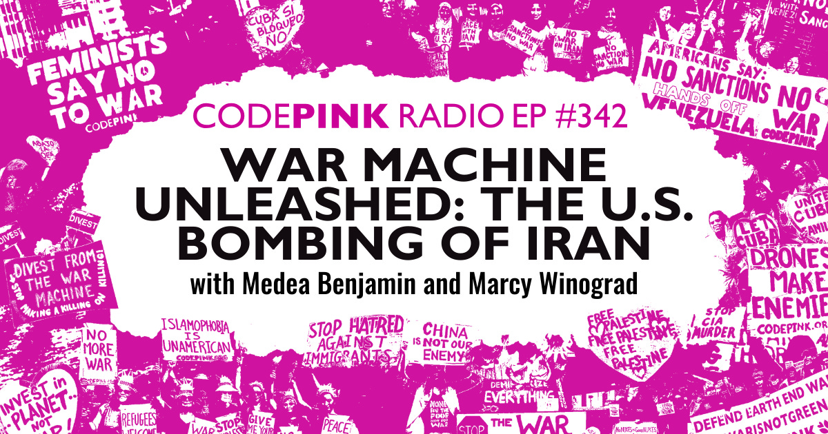 Episode 342: War Machine Unleashed: The U.S. Bombing of Iran: In this episode of CODEPINK Radio, cohosts Medea Benjamin and Marcy Winograd take on the US war machine as they deconstruct the madness that led to the US bombing of Iran. Our cohosts applaud global resistance to Trump and Netanyahu’s unprovoked war on a country of 93-million people and share their thoughts on what lies ahead for the Gulf states hosting US military bases.