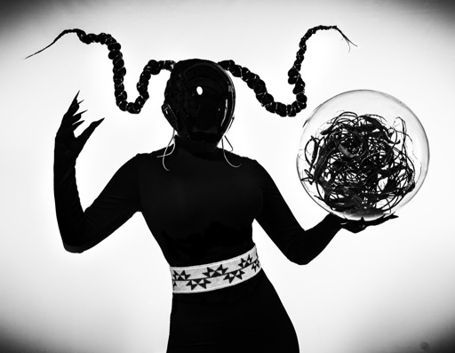 Her images include astronauts surrounded by corn cobs, women floating in water memories, chiefs in bold colors, Native rabbit women on the moon, and the three sisters brought to tattooed techno life.