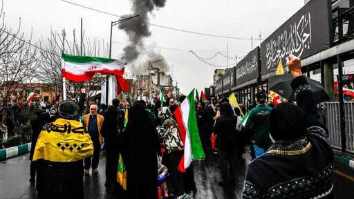 Smoke rises after an explosion during the World Quds Day march as participants carry Iranian flags and banners in Tehran, Iran, on March 13, 2026. Photo by Iranian President’s Press Office/Handout via Getty Images.