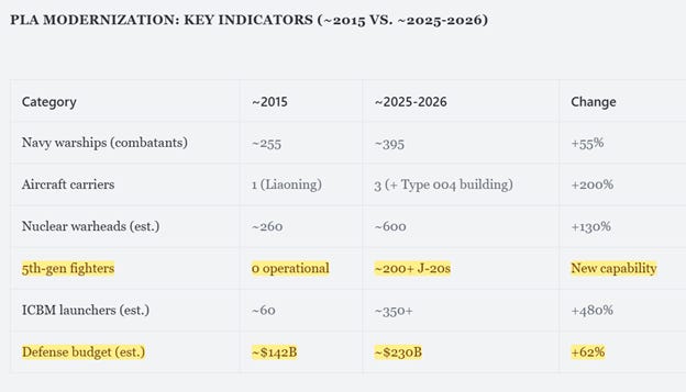 In just one decade, the PLA has built the world’s largest navy, and fleets of advanced aircraft and long range missiles.