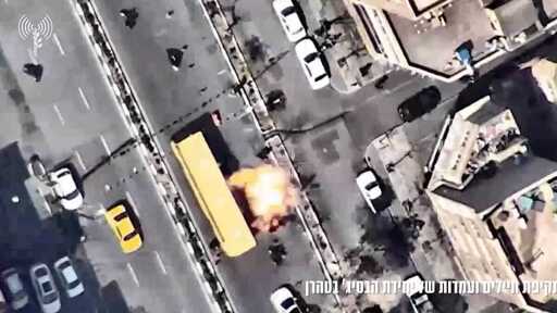 On Tuesday, the Israeli Air Force posted video of a strike it said targeted Basij militias in Tehran. The strike hit in one lane of a busy street as a bus passed by.