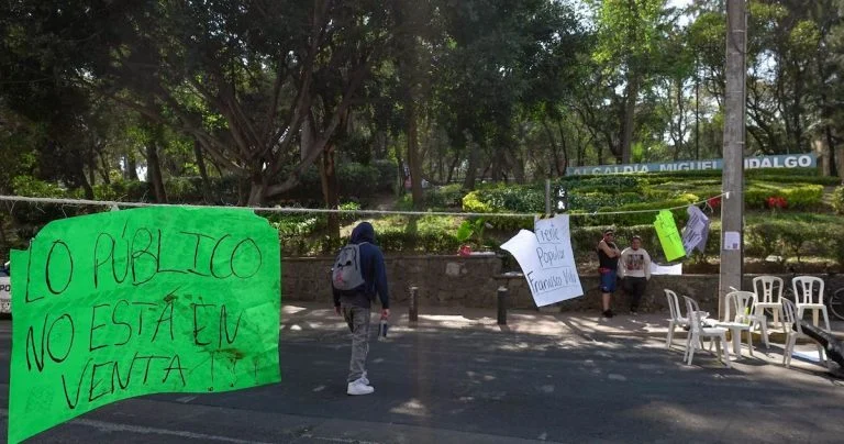 The activists Violeta Horcasitas, Yashodara Solano, and Jorge González were standing in front of the mayor’s office after collecting trash in the park, as they do every Wednesday as part of the activities and protests organized by residents to demand better care for this space in Tacubaya. It is the most frequented green space in the area, but also one with great historical significance: it was there, in the 19th century, that the Plan of Tacubaya was proclaimed, an event that sparked the Reform War and gave rise to the so-called Martyrs of Tacubaya. It is not just a park, but a site linked to a decisive episode in national history, yet today it is neglected, according to residents.