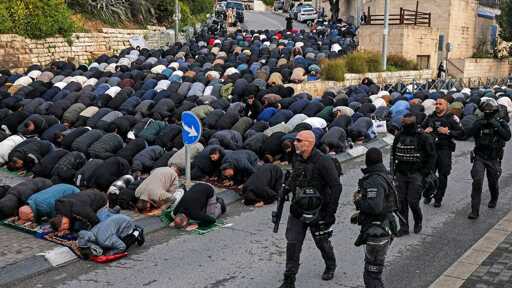 Israeli forces walk past Muslim worshippers gathered for early morning prayers for Eid al-Fitr outside the Jerusalem old city walls on March 20, 2026. Photo by AHMAD GHARABLI / AFP via Getty Images.