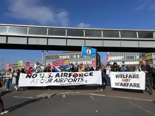 DOZENS of peace campaigners rallied at Prestwick Airport today to protest against the Scottish government-owned site’s continued use by the US military.