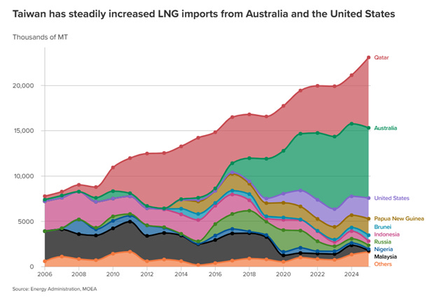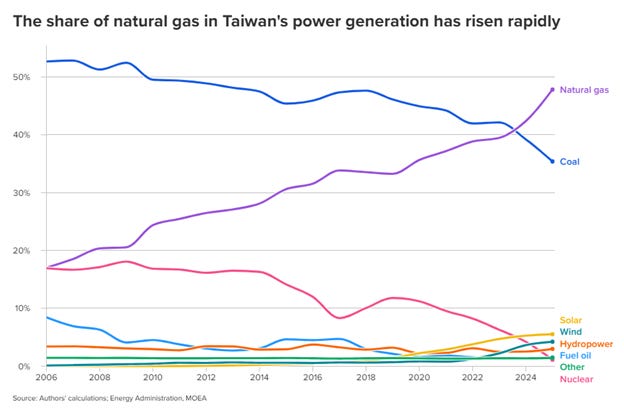 But Taiwan is facing a severe energy crunch. It is 97% dependent on foreign sources of energy. Liquefied Natural Gas powers most of its electricity generation, and its Middle East supplies are badly damaged and cut off.