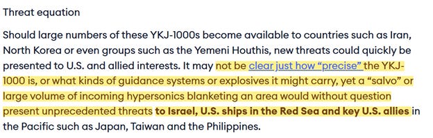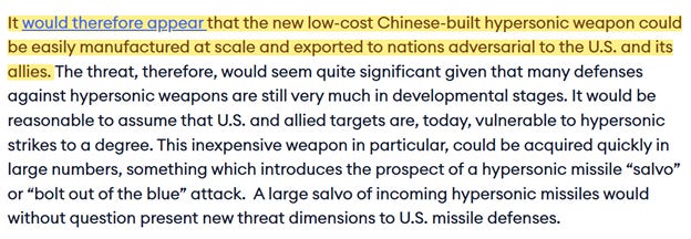 So that whole paragraph is important—all of it. They conclude that the Chinese hypersonic missiles can be manufactured, at scale, and exported to countries friendly to China, and adversarial to the United States and Israel. That is significant because there are no defenses against hypersonics at all.