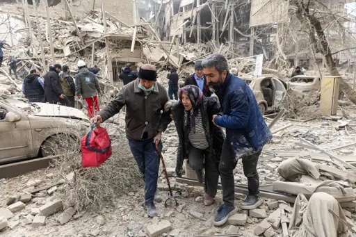 Photo: An elderly woman is helped following an airstrike on residences in Tehran. (Getty Images)