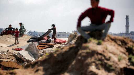 Children sit on the rubble of destroyed buildings at the Bureij camp in the central Gaza Strip on March 27, 2026. Photo by Eyad Baba / AFP via Getty Images.