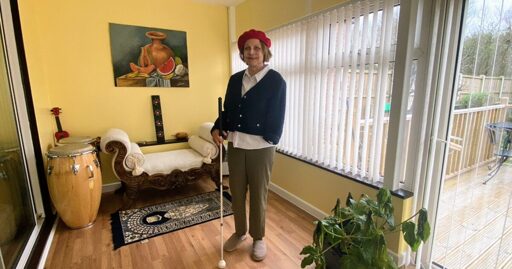 A woman with shoulder-length brown hair and a red beret holds a cane in her right hand. Her left arm is amputated. She stands in a yellow living room with a chaise longue and a still life painting. A drum stands in the corner. Through the blinds we can see a wooden patio