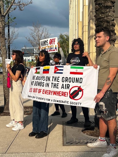 “For years, the United States has reached into Latin America and tried to shape what happens in countries like Venezuela,” Jayce Solis, a member of Tampa Bay SDS, said. “Today’s rally was about making it clear that we’re not going to stay silent and we’re going to keep pushing back against U.S. intervention in Venezuela and in other countries too.”