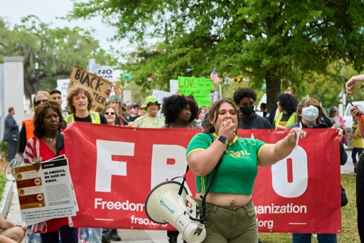 After the first set of speeches, organizers gathered the crowd to march around the capitol complex. Immediately, the march was disrupted by violent officers with the Florida Department of Law Enforcement (FDLE).