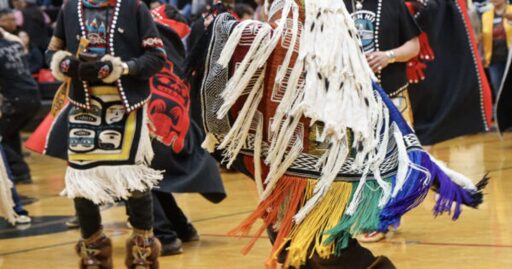 A rainbow pride Ravenstail robe, wove by dozens of mentors and youth, was danced for the first time this week on the court during the Gold Medal basketball tournament in Juneau.