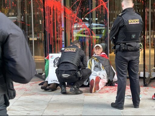 On 30 March 2026, two activists from the group People Against Genocide (PAG) targeted the London headquarters of Chubb Insurance, as well as the offices of Sompo, owner of Aspen Insurance. They sprayed the front of the building with symbolic blood-red paint, before locking-on outside the front entrance.
