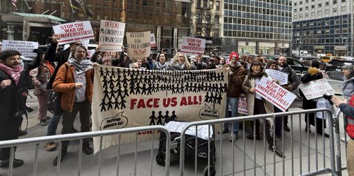 The Fired Four campaign has become a central rallying cry at CUNY and beyond. The PSC, the union representing faculty, graduate assistants, and several staff titles at the university strongly condemned the firings in a social media post that was cross-posted with Jewish Voice for Peace: “While the university refuses to offer an explanation, the PSC sees all appearances of an ideological purge and demands the reinstatement of our affected members. Now more than ever, we must defend free expression. No to the new McCarthyism!”