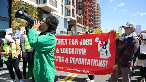 Washington, DC – On Saturday, March 28, hundreds gathered in Washington DC’s Anacostia neighborhood before noon to join a contingent for the No Kings protest demanding “No Trump, no war, no ICE.” The contingent began with a rally at the Anacostia Metro station before marching to join the large protest.