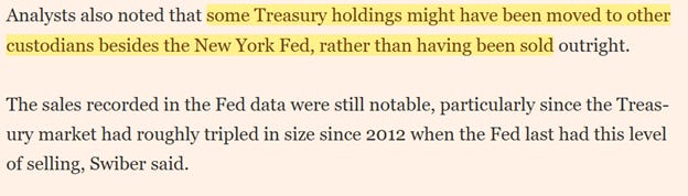 Some of this activity might not be outright sales of US Treasury bonds. It may be that FX managers in these countries are just changing the custodian, from New York to Hong Kong, or perhaps to custody in countries where Western regulators can’t seize them. We’ll follow up on that question when the data become more clear. But we don’t think that’s happening here, this time. These are almost certainly outright sales, not merely a transfer of custody, or a liquidation in New York that’s offset by a purchase in another system, because the yields are going up, and in the case of India, for example, just moving the bonds from New York to Hong Kong doesn’t solve the problem they have, which is that they can’t buy oil from Iran or Russia, using dollars.