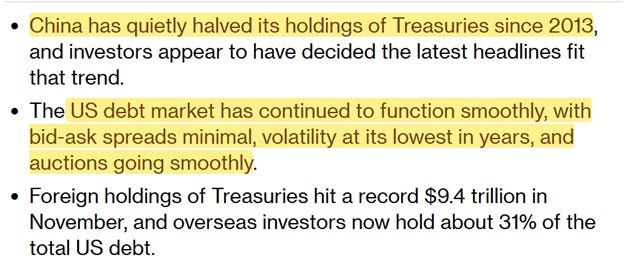 Bloomberg got to work right away, trying to assess the impact of that move by China, and note in the beginning that the Chinese have been selling Treasury bonds for years, and everything is just fine: The debt market is functioning smoothly, spreads are narrow, volatility is the lowest in years, auctions are also going smoothly. They even said “smoothly” twice.