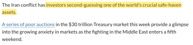 The Treasury auctions that were going so “smoothly” in February, fell apart in March. They saw the lowest buyer interest in over three years, and Marketwatch leads their piece by saying that investors are second-guessing the world’s most important safe-haven investments: