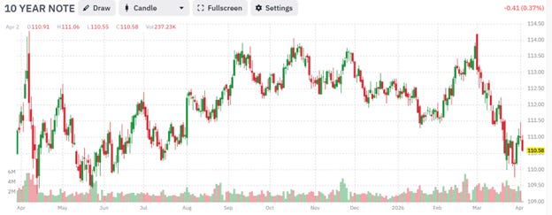 The prices for these bonds are falling, because of all the selling. Here is the one-year chart for 10-year Treasury notes: