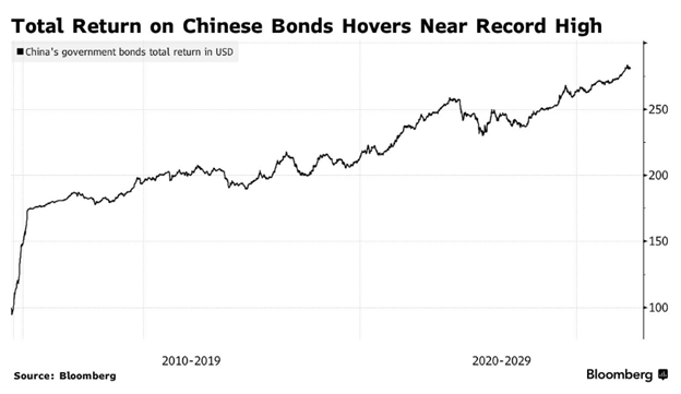 On a total return (inflation-adjusted) basis, bonds issued by the Chinese government is one of the highest in the world.