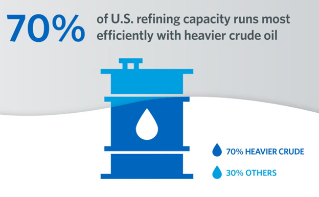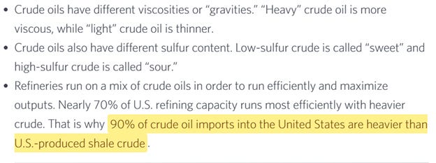 That is a function of the American refining industry—the oil coming from the shale patch is lighter and sweeter than what US refineries are set up to handle: 70% of total US refining is for heavy crude, and so the US exports the light sweet to be refined elsewhere:
