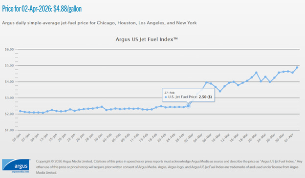 Prices for jet fuel have doubled in just six weeks. That’s also true in the United States. On 27 February, the average jet fuel prices across the major US hubs were $2.50 a gallon, and now they’re $5.00 a gallon.