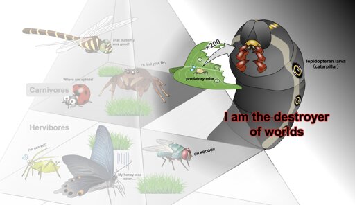 Predators don’t expect to be preyed upon, and especially not by herbivores such as caterpillars. The slow-moving, leaf-eating larvae may only intend to consume plants, but sometimes tiny creatures making their homes under leaves unwittingly become dinner: cue the mites.