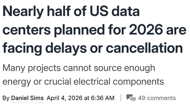 Half of planned US data center builds have been delayed or canceled, growth limited by shortages of power infrastructure and parts from China — the AI build-out flips the breakers
