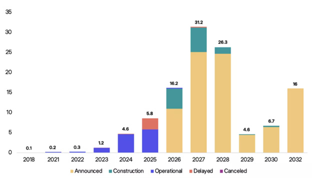 These data go out for the next six years—data centers that are announced, and under construction. Even for 2026, less than half of the announced capacity for data centers is under construction now, and none of it is yet online. For 2027, over 2/3rds of the announced capacity has not yet begun.