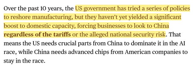 The tariffs don’t matter, the “alleged national security risk” doesn’t matter. When contractors are paid billions of dollars to build data centers for Amazon and Facebook, they’re looking for electric gear from whoever can make it. China has near-monopolies on the supply chains from end-to-end, and nobody thinks that will change anytime soon.