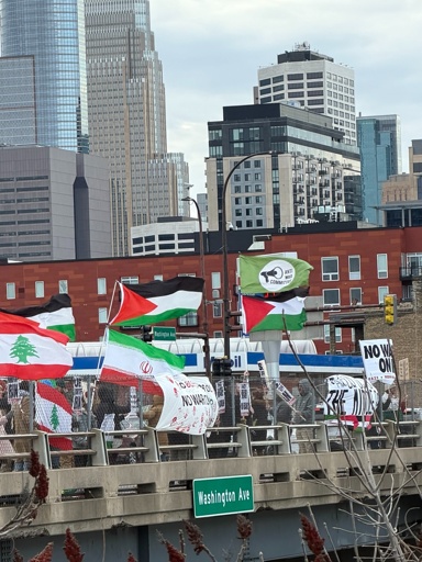 Wyatt Miller, member of the AWC, explained the intent behind the protest, “This bridge is close to the I-35W bridge over the Mississippi that collapsed in 2007. Here in Minneapolis, we know that the destruction of critical infrastructure is no joke. U.S-Israeli bombings are a war crime.”