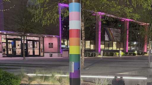 Now, gay and trans flag stripes are permanently wrapped around the metal poles outside Boise City Hall, and behind them, draped from the windows, is a new banner, too.