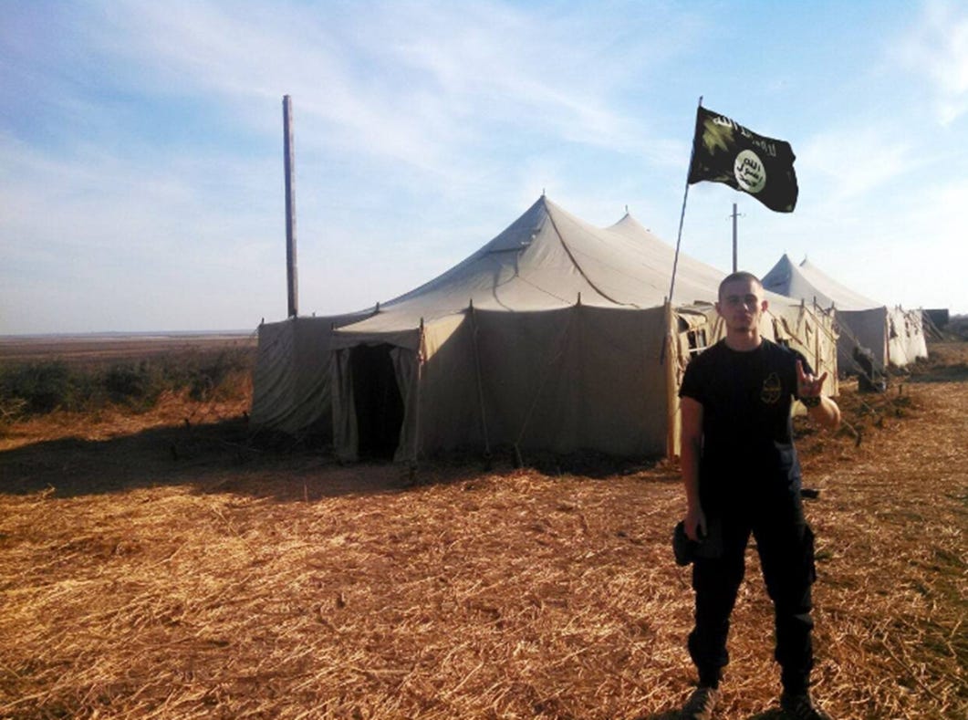 This is allegedly a picture of Maksym Pyska with an ISIS flag. Pyska, a football hooligan, fought in the Azov Battalion/Regiment, became the chief of staff of its “Civil Corps” (forerunner to the National Corps), and got involved with the Azovite “Youth Corps.” Now he works for Snake Island Institute.