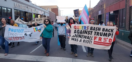 Kacey Hicks of Denver Students for a Democratic Society, who emceed the action at the capitol, told the crowd, “This attack is just one of many carried out by the Trump administration and its allies on queer and trans people. It is one of many attacks used to try to make trans and queer people afraid while our rights keep getting stripped away.”