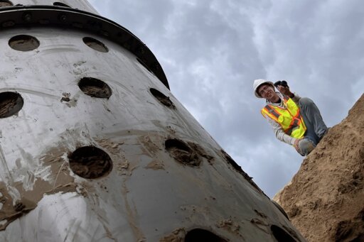 At the Deep Soil Ecotron excavation site, a hydraulic press pushes a lysimeter deeper into the ground. The crew constantly clears soil from the base of the column as it descends. (Photo courtesy of University of Idaho)